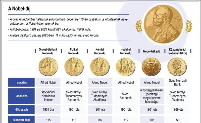 Október 13-áig bezárólag jelentik be, hogy kik kapják idén a Nobel-díjakat. Hétfőn az orvosi-élettani kategóriában hirdettek nyertest Stockholmban. Kedden a fizikai, szerdán a kémiai Nobel-díj kitüntetettjeit ismerteti a Svéd Királyi Tudományos Akadémia. A hagyományoknak megfelelően a Svéd Akadémia által odaítélt irodalmi Nobel-díj nyertesét csütörtökön hirdetik ki. Október 10-én Oslóban hozzák nyilvánosságra a Nobel-békedíj idei kitüntetettjét, majd október 13-án ismét Stockholmban a svéd jegybank által alapított közgazdasági Nobel-emlékérem nyertesét. A díjakat, amelyek mellé 11 millió svéd korona jár, ami 388 millió forintnak felel meg, a szokásoknak megfelelően az elismerést alapító Alfred Nobel halálának évfordulóján, december 10-én adják át a svéd fővárosban.