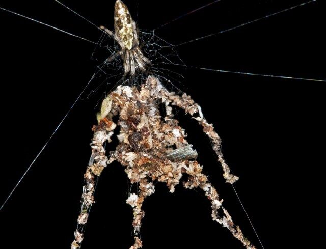 E hálók közepén azonban valami egészen szokatlan dolog jelenik meg: egy szobor, vagy ha úgy jobban tetszik, egy madárijesztő, mely távolról úgy fest, mintha egy jóval nagyobb pók ülne a hálóban. Az állatok növényi maradékokat és zsákmányuk darabjait gyűjtik össze, majd ezekből pókszerű formát építenek, amelynek saját ?teste? és ?lába? is van.