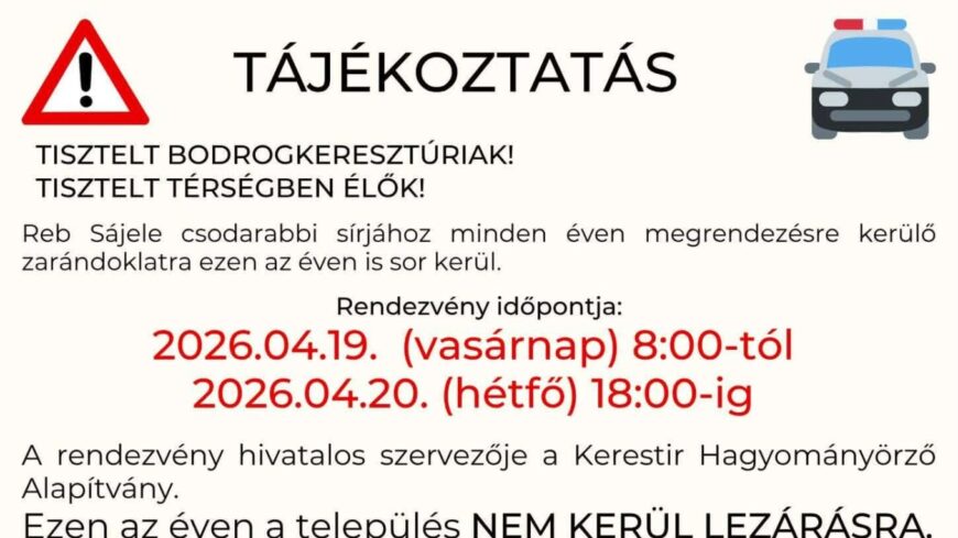 A zarándoklat április 19-én vasárnap reggel kezdődik és április 20-án estig tart. Ez idő alatt Bodrogkeresztúron forgalomlassításra és ideiglenes forgalmi rend változásra kell számítani, ugyanakkor a települést nem zárják le teljesen.A hatóságok kérik a lakosság türelmét és együttműködését.
