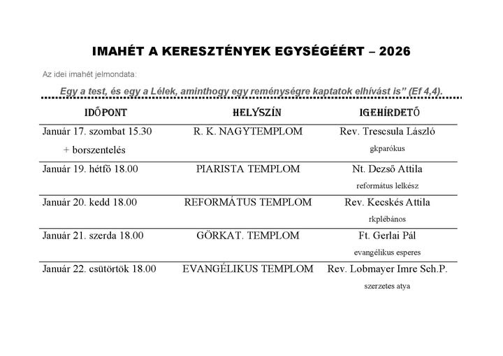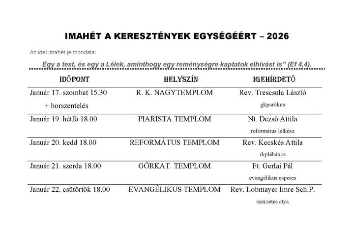 Idén is megrendezik Sátoraljaújhelyen az Imahét a keresztények egységéért programsorozatot. A Sátoraljaújhelyi Szent István Király Főplébánia tájékoztatása szerint az ökumenikus alkalmak január 17. és 22. között várják a híveket a város különböző templomaiban. A közös imádságok a római katolikus nagytemplomban, a piarista, a református, a görögkatolikus és az evangélikus templomban zajlanak. Az istentiszteleteken római katolikus, református, evangélikus és görögkatolikus lelkipásztorok szolgálnak. Az idei imahét jelmondata: ?Egy a test és egy a Lélek?, amely a keresztények közötti egység fontosságát hangsúlyozza. A szervezők minden érdeklődőt szeretettel várnak. További információ a zemplenmedia.hu oldalán is közzétett plakáton található.